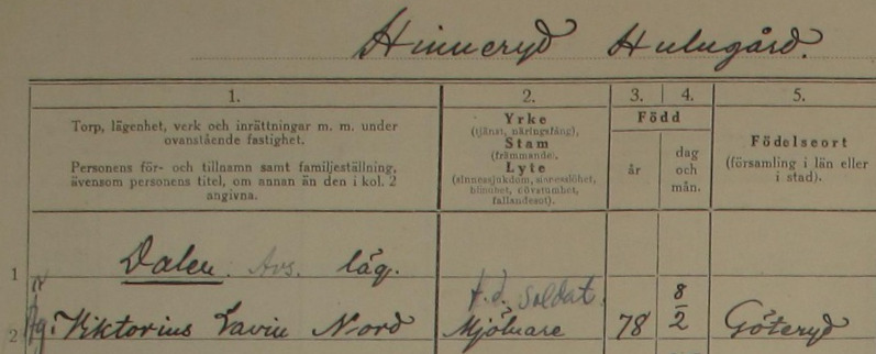 Viktorius Lavin var bosatt på lägenheten Dalen under Hinneryd Hulugård tillsammans med sin familj. Ur Hinneryds församlingsbok 1922-1939.